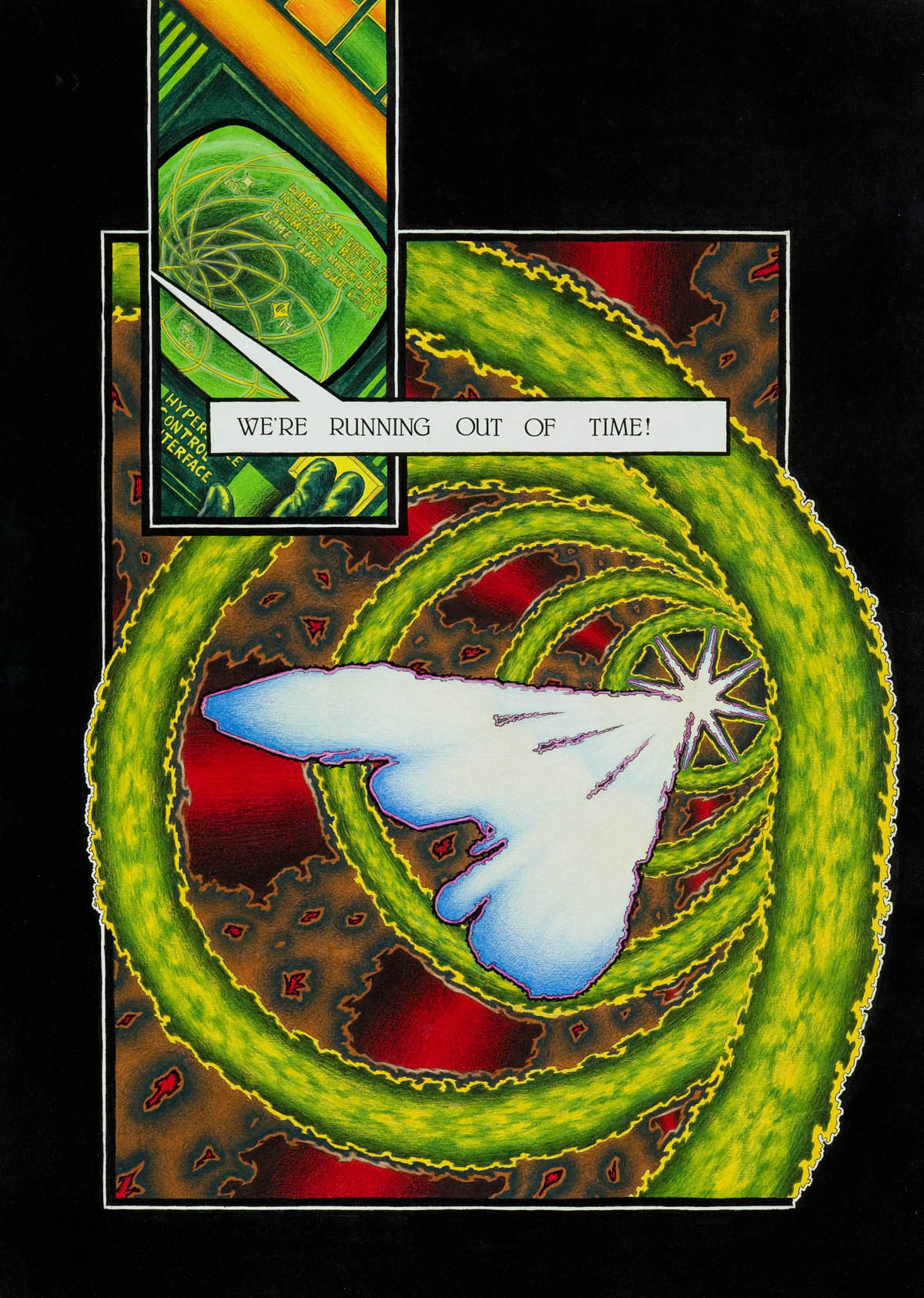 On the final page, the ship emerges from hyperspace only to be attacked by the alien ship (which happened all too often in the game!). The alien is a very organic ship, as if the ship itself were a living organism.