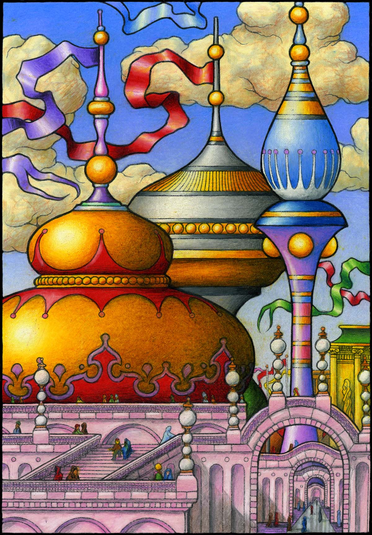 EQUINOX has over 52 detailed images to color. I drew each image on a 15 x 20″ piece of illustration board and reduced it to standard 8.5 x 11″ for the book. This allowed me to hand-draw the images cleanly and with sufficient detail. I always try to draw images as large as possible, because that makes it better for reproduction….even though it’s a pain to scan in sections and stitch them together!
