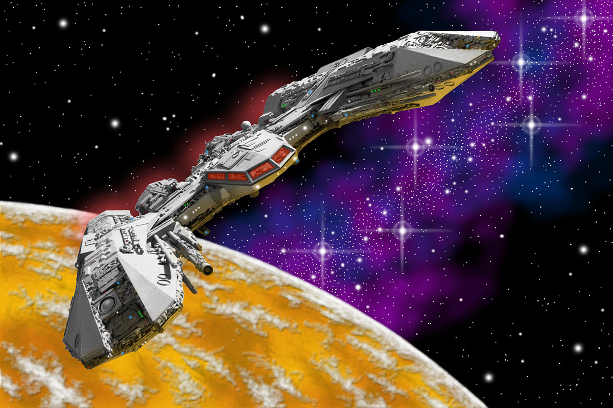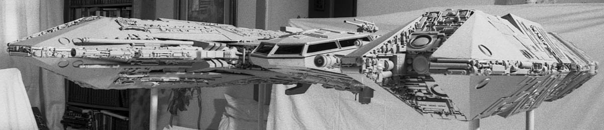I started making the model in the year off I took between my freshman and sophomore year in college, around 1979. That’s when I got my first job at a large commercial photography studio as well. The plan was to photograph the model, paint large backgrounds of space, planets, etc., and then print images of the model, hand-color them, and affix them to the painted backgrounds. That final composite would then be rephotographed along with some simple SFX, like laser beams and engine glow.