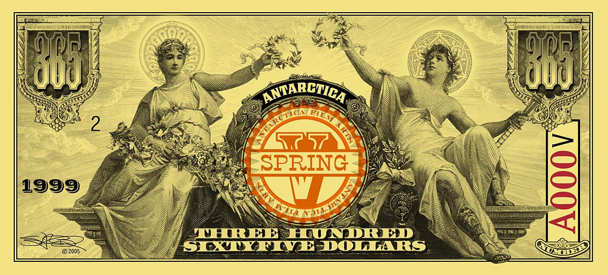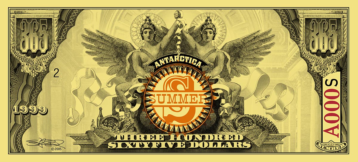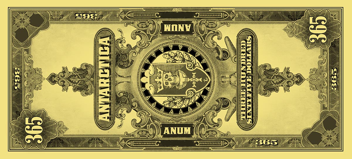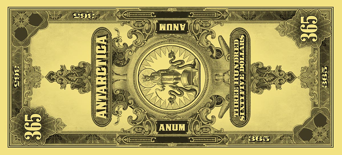The $365 Dream-Dollar notes are the culmination of the Natural Number System, where 365 days equals One Year or Anum. This was the last note created in the series (at around 2003), after four years of work. It is printed on gold paper stock for several reasons: gold is the color of wealth and worldly success and this note represents the completion of the System; gold is also the color of the sun and the $365 note represents Transformation. As 365 days Transforms into One Year with the annual seasonal cycle, so also the sun affects the world in daily and annual cycles. Making the front a horizontal design and the back a vertical design also reinforces the Transformative nature of this note.