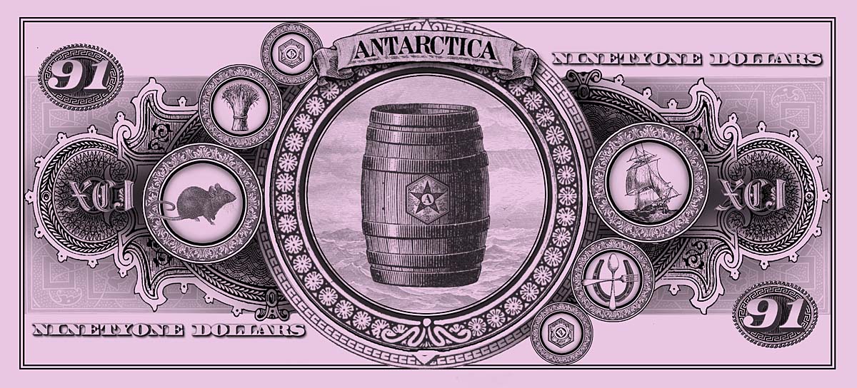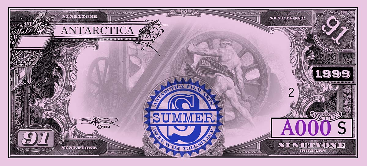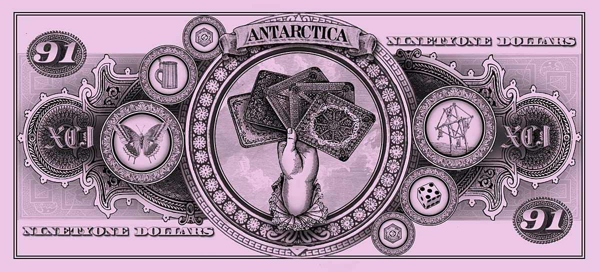 Work and Play are the themes of the Summer note. Like two sides of the same coin, Work and Play are viewed as two of the most important core values in the life of the colony. Shown on the obverse of the note is an idealized scene of the Constonian Iron Foundry, so important to the life of both remote outposts. The reverse depicts several examples of Play, both physical and mental. What is especially interesting is the strong element of fate and chance that are depicted in these examples, which include dice and cards.