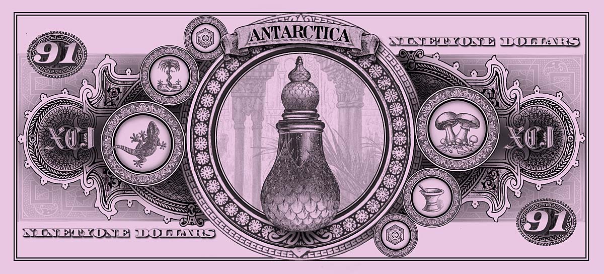 In the season of Spring there is growth, restoration, and Healing. The front of the Spring notes shows the suffering soul finding solace and comfort in the embrace of the Healing Spirit. They sit before the Great Waterfall at the head of the Eden River, the river that serves many needs for Constonia. Many scholars, however, consider the waterfall to be another symbol for the source of health and healing. The reverse of this note depicts the Elixir, that which cures and restores both the body and soul. The exotic setting evokes mystery and occult knowledge.