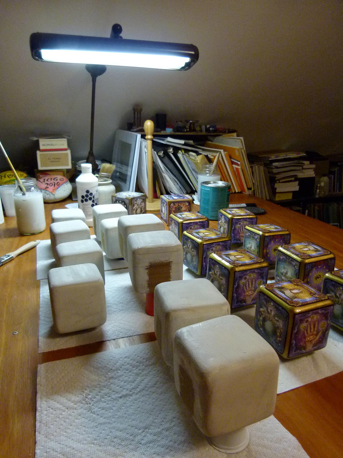 First, I got an eight-foot long board of 4 x 4″ cedar wood. I cut it into 4-inch squares, and sanded them down to smooth, rounded cubes with a belt sander. Above, you can see the cubes getting their first coat of gesso to seal the surface and prepare it for paint. After a couple of coats of gesso, I painted the cubes gold, silver, bronze, or copper depending on which Hexikon I was making.