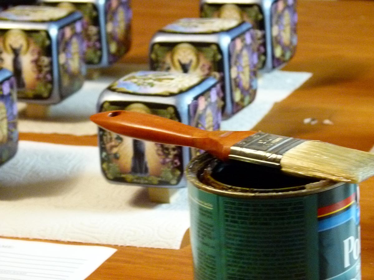 The final step is the application of four coats of polyurithane. Yes, a minimum of four coats (sometimes more), with sanding after each coat. It was difficult to avoid bubbles, so you had to paint with care.