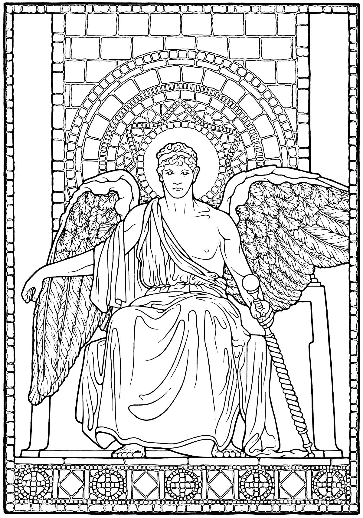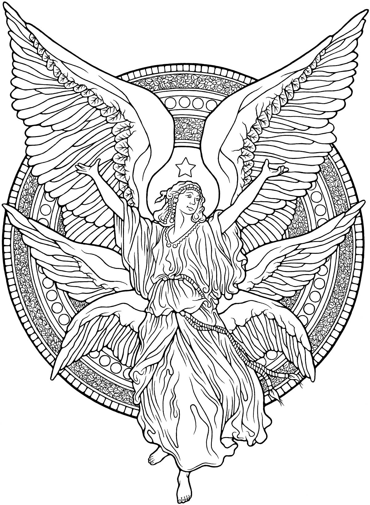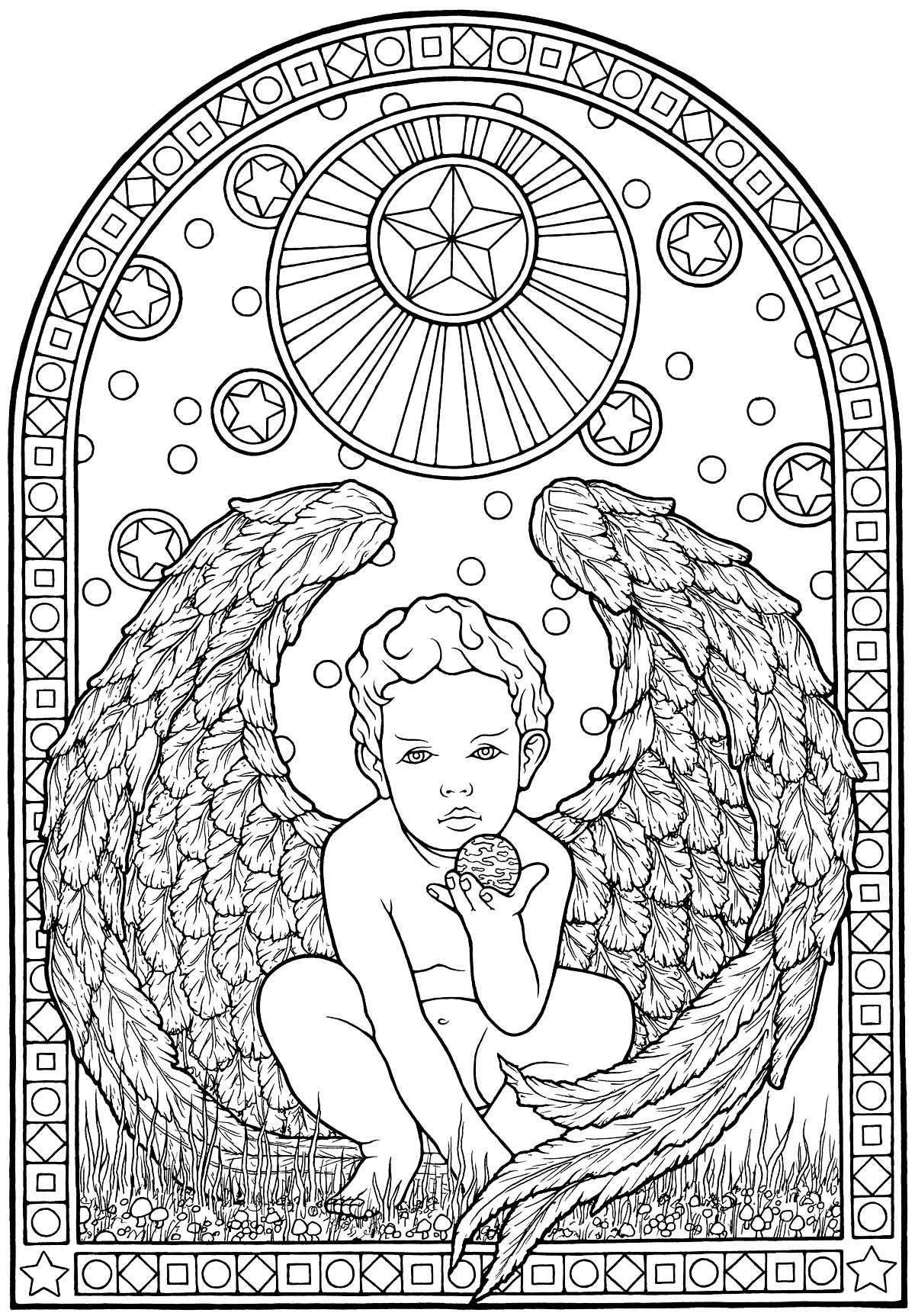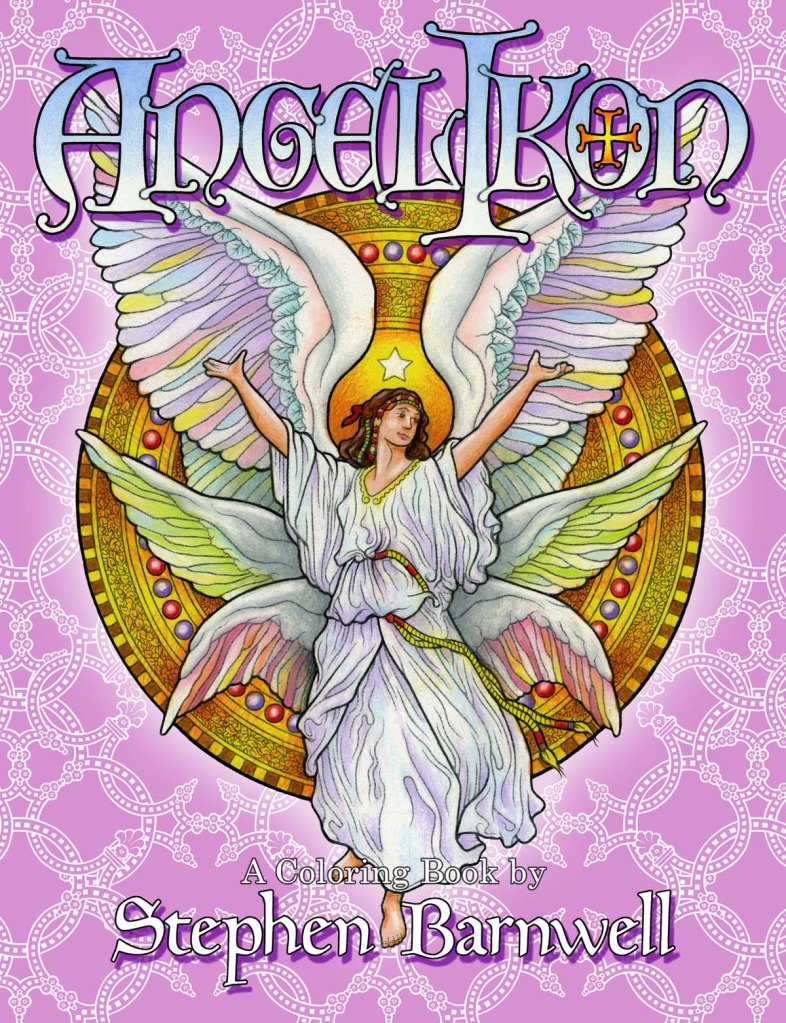 After the success of my first coloring book, EQUINOX, I decided to make another one. I’ve always liked drawing angels, and I was sick and tired of fluffy, dumb-looking angels in so many coloring books that I saw, so I decided to do a book on serious angels. These angels would range from peaceful or happy angels to strong, powerful angels. Real angels have power – they’re not the cute Fiorucci cherubs, oh no.