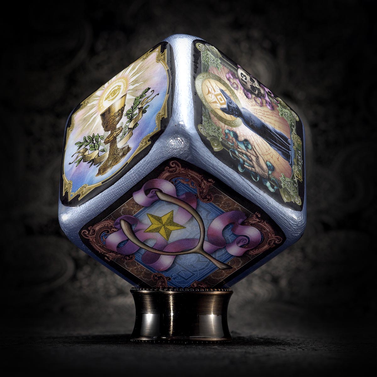 The fourth Hexikon I made was Fortuna, exploring the aspects of Fate. The cube was painted metallic blue, and, as always, the six images were pasted on opposite sides reflecting opposite concepts. I had fun with this Hexikon, because the symbols represent very primal themes: Blessing, Curse, Luck, Jinx, etc. We have always been fascinated with the future, and as a species have always sought ways to change it.