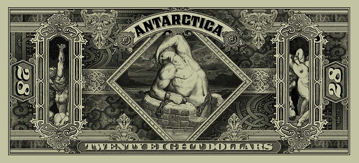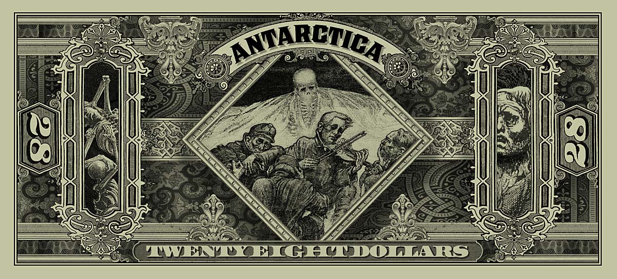 The season of Winter is when Hope is needed and is manifest. The hope of love, of peace, and the hope of rebirth. Therefore, on the obverse of this note is the image of Hope, with his sword draped in the olive branch, and the anchor symbol in the background. When Hope is gone, all we are left with is Fear, and the most primal fear is the fear of death.