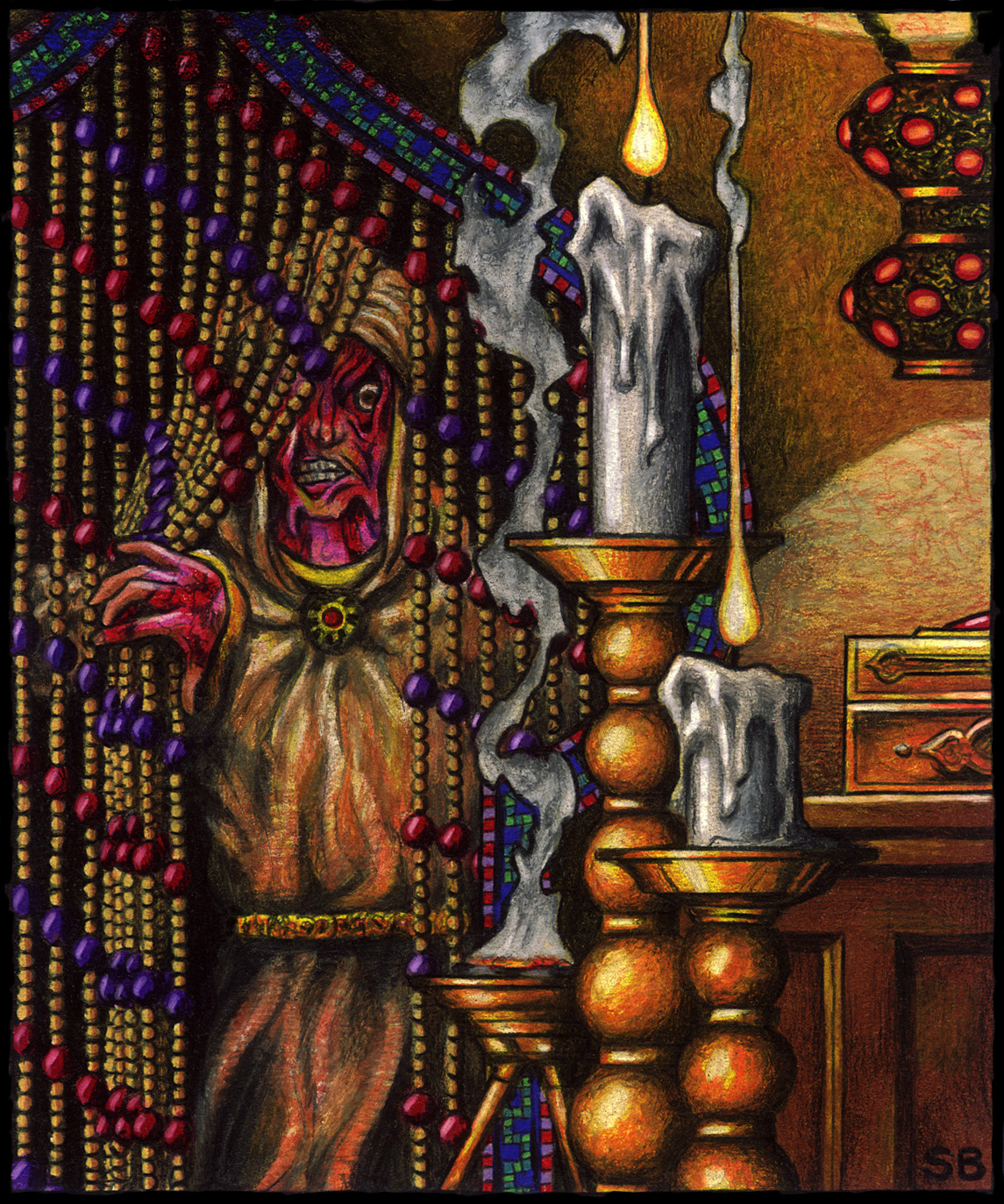 One of my favorites was doing the Faraz Najir card. He had a melted face and lived in the Middle east. I happen to love Middle Eastern decoration and artifacts – in fact, the brass candlesticks and the hanging lamp (at the top right) were based on Moroccan objects that were in my living room! I admit I was also probably influenced by an Indiana Jones movie or two…..