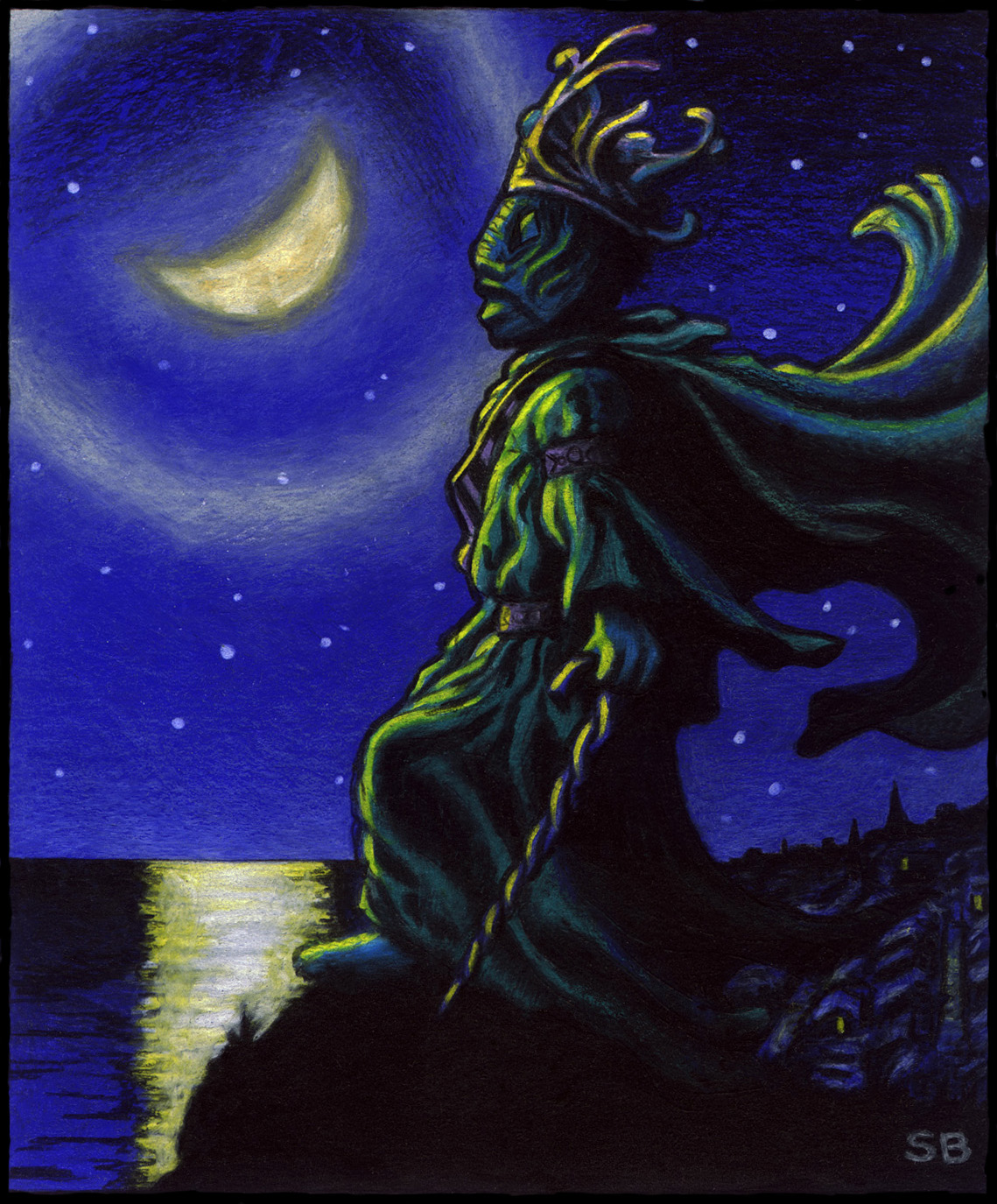 It was loads of fun drawing the Deep Ones, or perhaps they are offspring of the Deep Ones, I’m not sure any more. I wanted to create a dark, gothic mood for these, so I used a lot of candlelight and, in this one, stained glass windows. Titled angles create not just a dynamic composition, but also create an atmosphere of disturbance — something is wrong or unbalanced.