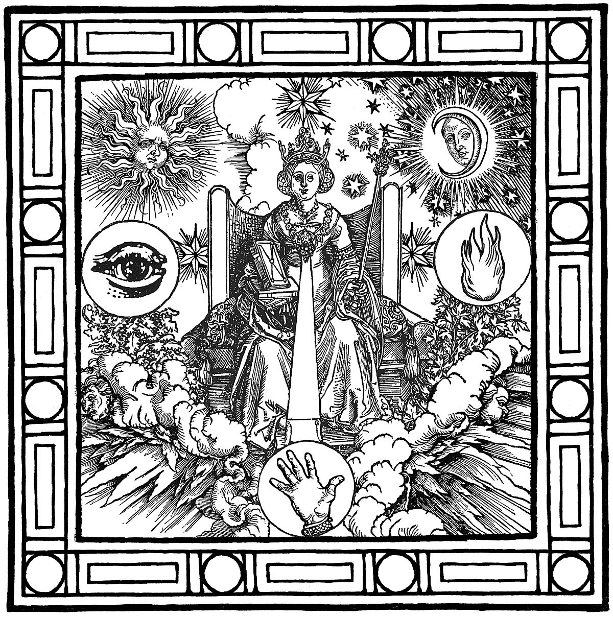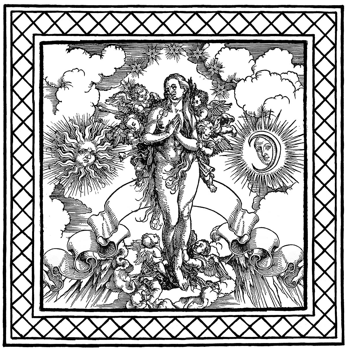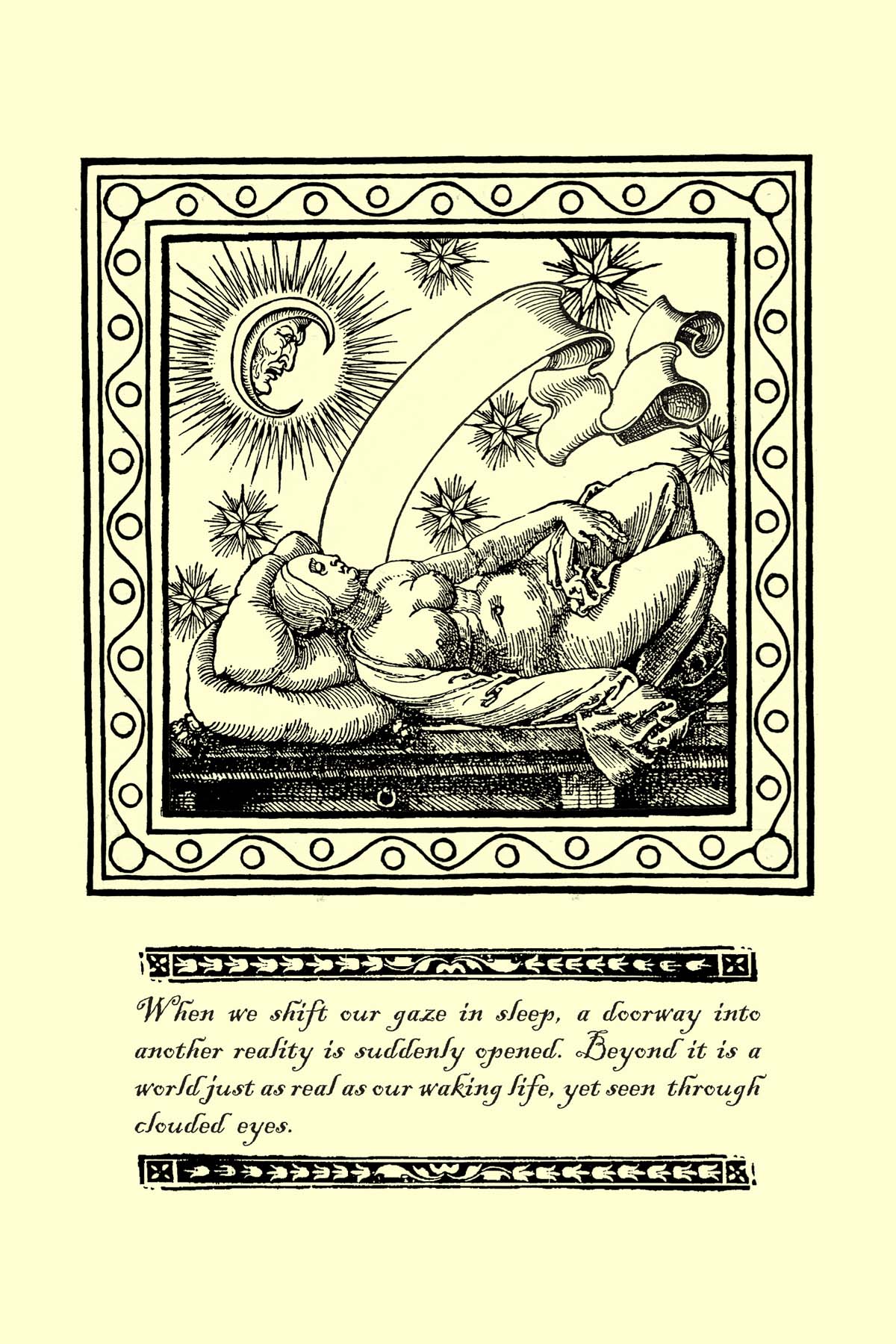 Above is a sample page from DreamTime, showing the illustration with a border, plus the quote from Oneirognosis. And below are some blank, uncolored images as they appear in the book: