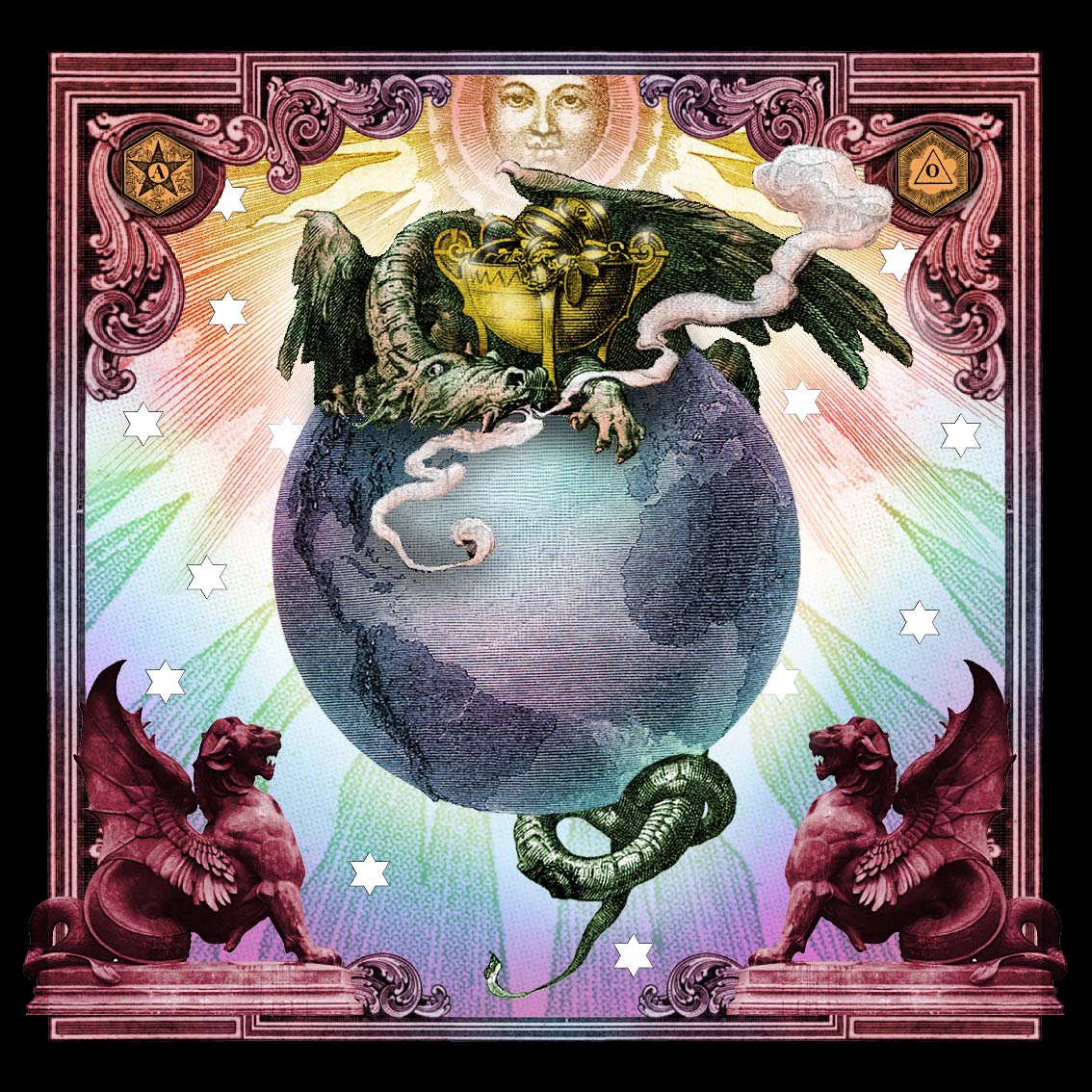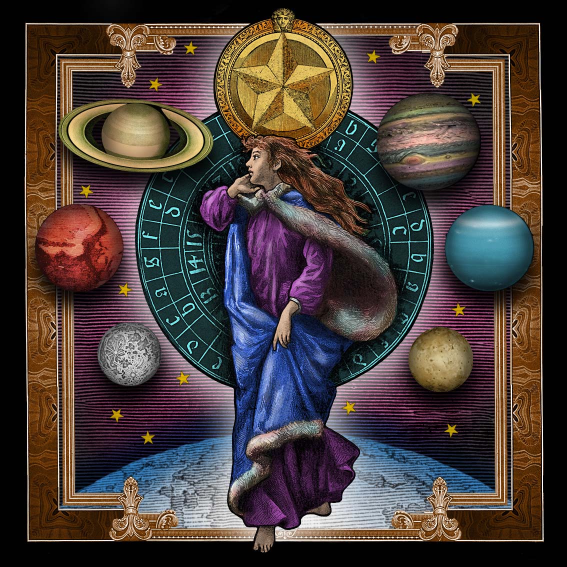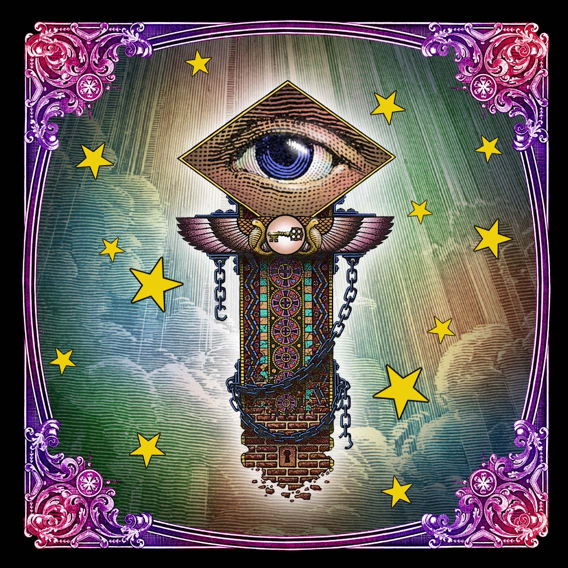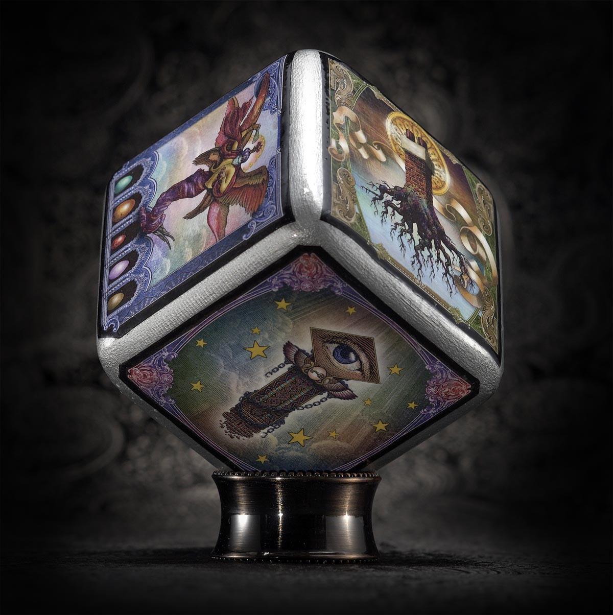The third Hexikon that I created was Oneiros, which is the Greek word for dreams. Dreams have always been central to my artmaking, and many of my works have been directly inspired by dreams. This solid cedar cube was painted silver, which for me is the color of the moon, and therefore is symbolic of our nocturnal journeys. Usually, the images on Hexikons pair off on opposite sides of the cube to represent opposite meanings, but in Oneiros it is not so cut-and-dry. Dreams often have multiple meanings, and so they do not represent singular concepts, therefore the “opposite meanings” for this cube do not apply.