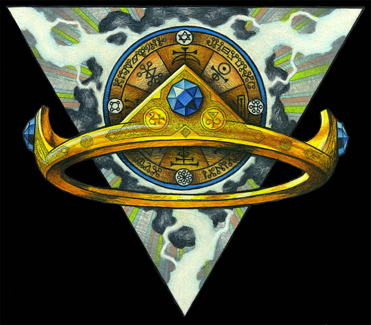 Another cool artifact is the Crown of Solomon, again taken from the Hebrew Bible. Behind the crown is a seal, filled with arcane sigils and designs. I did this mainly because there is a legend from the Testament of Solomon that says that Solomon built the Temple in Jerusalem by enslaving a legion of demons by the use of a magic ring given to him by the archangel Michael. Solomon employed magic to build the temple, and after he was finished, he sealed the demons in a jar and threw the jar into a deep lake. That would have rid the world of demons, but unfortunately some thieves saw Solomon cast the jar into the water. They thought that there must be treasure in the jar, so they dove down and recovered it, and when they opened it, they released all the demons back into the world.