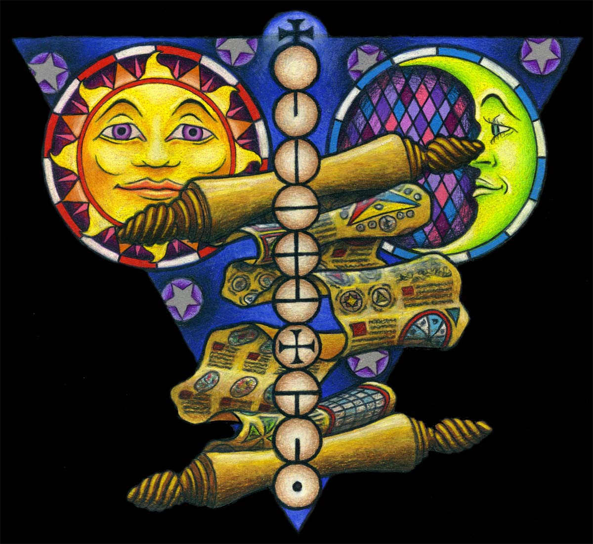 For the Heresy, Kingdom Come collectible card game (CCG), I did around 36 cards. Most of which were the Alephs, or magic items. This group of Heresy cards are informed by the occult discipline of alchemy. There were several religious and esoteric belief systems incorporated into Heresy: Judeo-Christian angels, demons, and artifacts; Alchemy; Hermetic magic; and even Astrology. No real practices of these belief systems were employed, but they were incorporated to give the game a sense of historical authenticity (in my opinion). So, to further this attempt for historical accuracy in the belief systems, I did research and tried to use real, historical esoteric symbols and visual traditions in my designs for the cards. In this case, the lettering on the circular scroll in Alchemic Citadel are characters from an “angelic alphabet”, taken from medieval sources and a fantastic book called A Dictionary of Angels by Gustov Davidson.