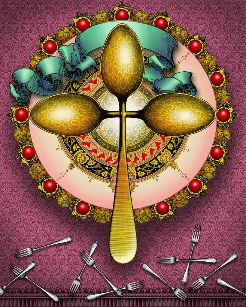 By turning the spoon into a cross-like symbol, this adds new dimensions of faith and spiritual nourishment. The forks below suggest the Other, which is excluded or even conquered. I think that this piece is deceptively simple, and contains a host of meanings and connotations.