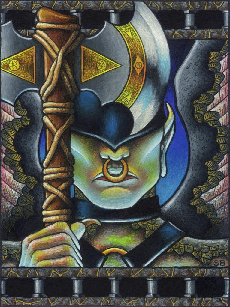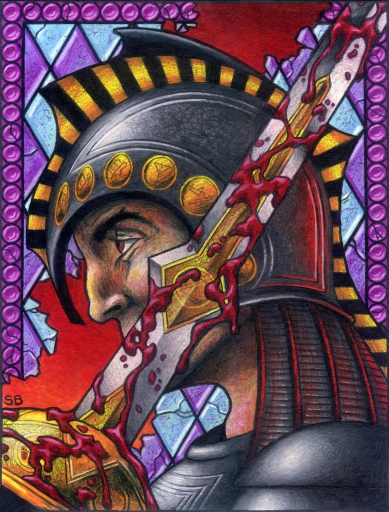 The Powers and Authorities that I did the the Heresy: Kingdom Come collectible card game, included some rather nasty types. These three are in a group I call the Punishers. Their job appears to punish the players, or their opponents, in a quite powerful way. This one, the Chief of the Apostates was a warrior angel, avenging those who have lost their faith.